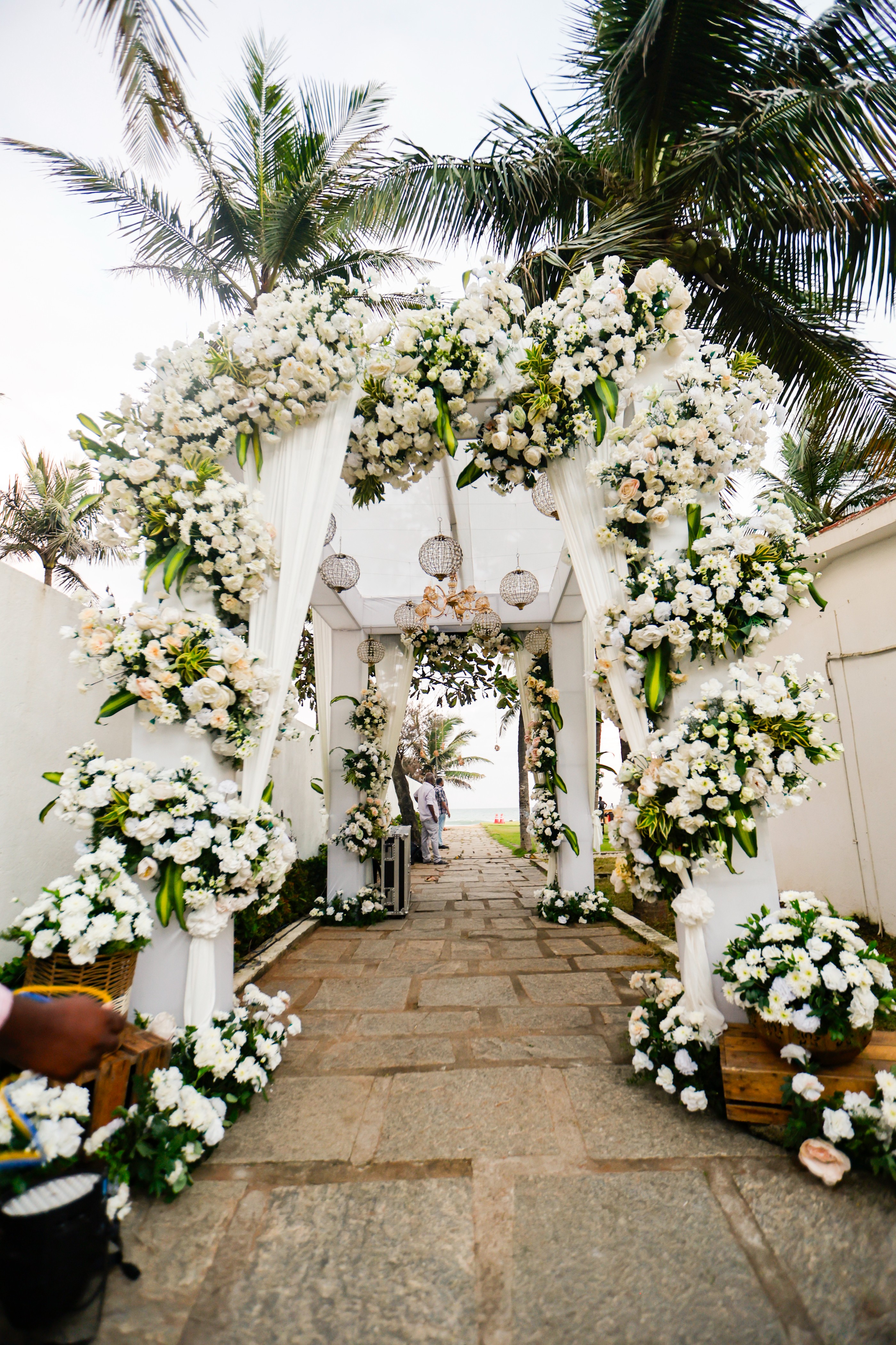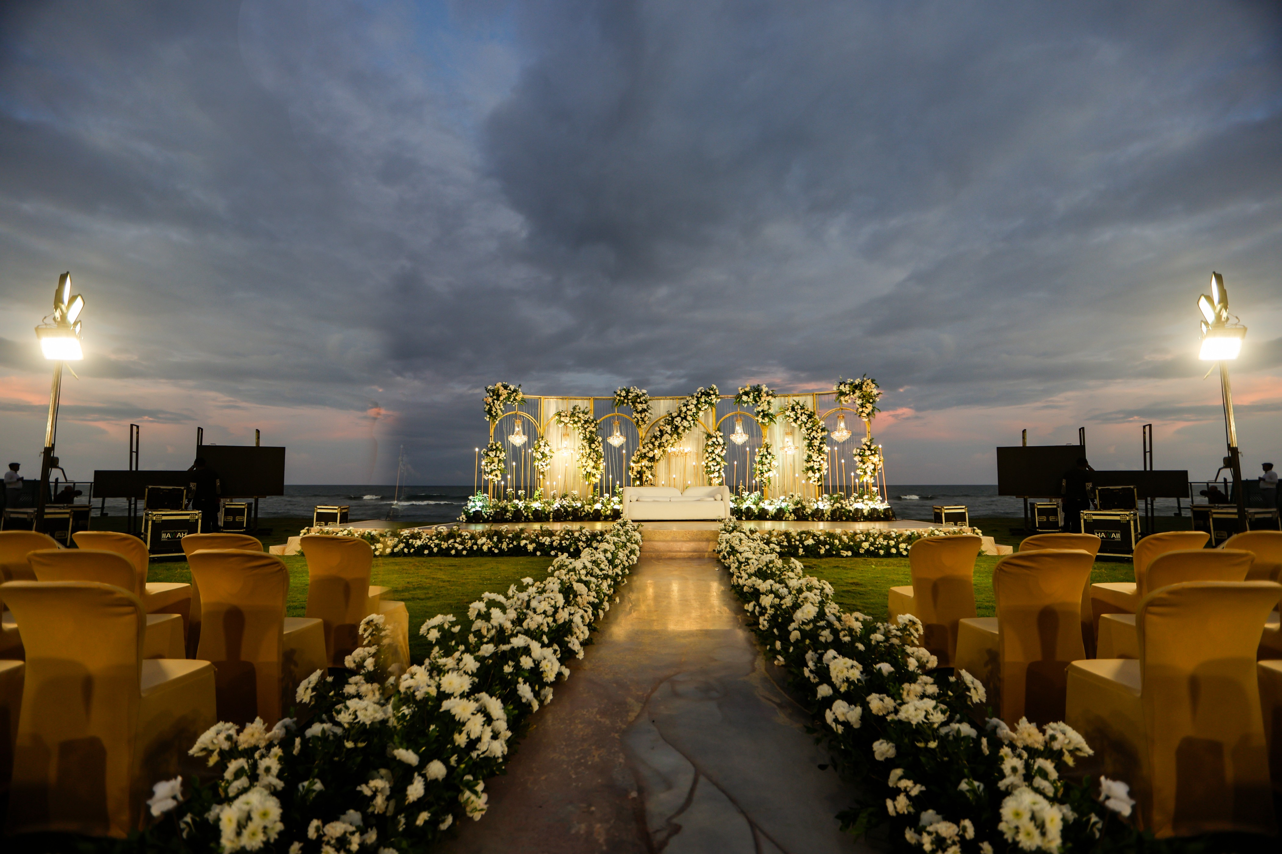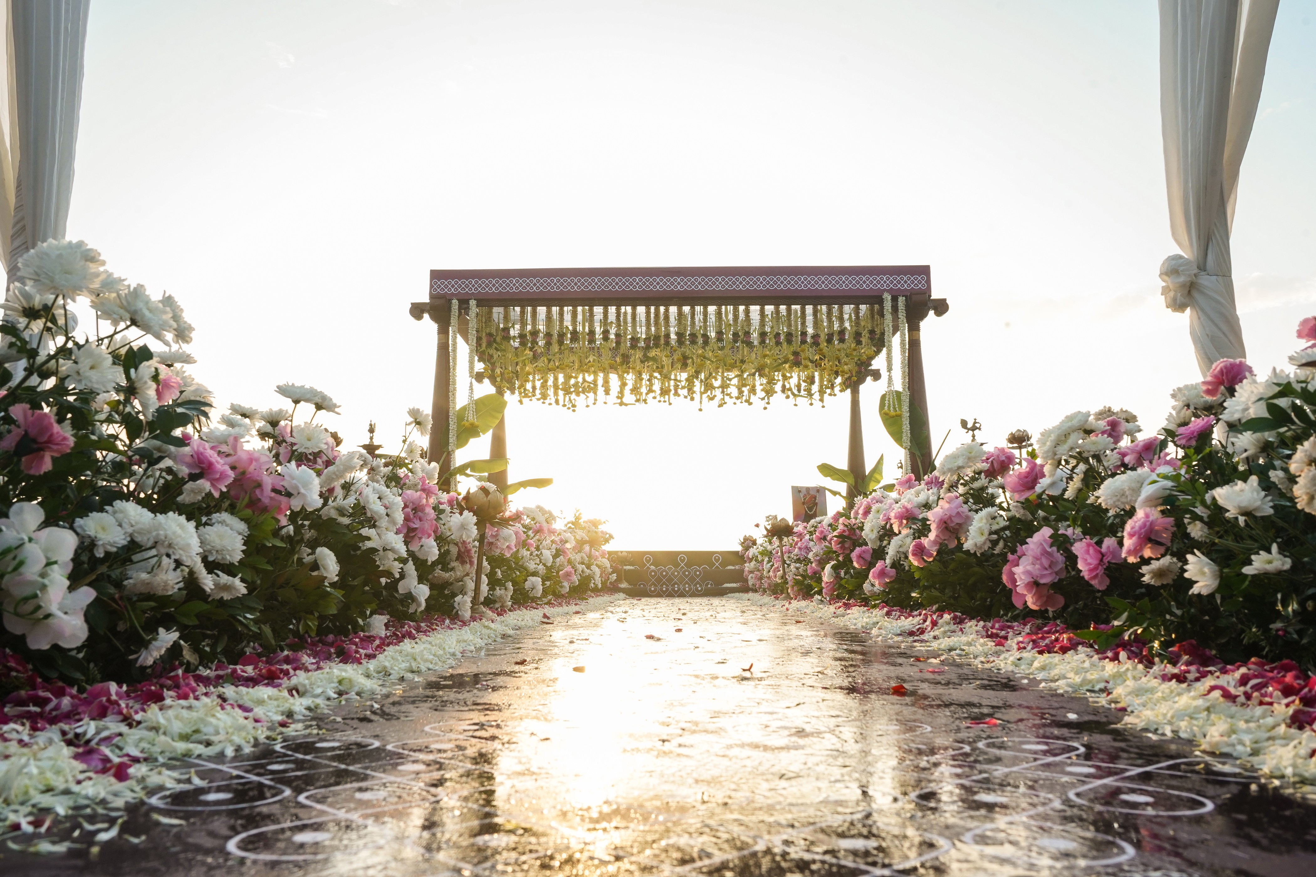The heart of a beach wedding lies in the serene ceremony setup. A mandap framed with bamboo or driftwood, gently draped in soft pastels or ivory fabrics, creates a divine focal point with the ocean as its backdrop. Adorned with jasmine, orchids, and tropical greenery, the mandap offers a peaceful yet festive atmosphere. The aisle leading to it is beautifully marked with shells, floral cones, and floating petals, welcoming the couple into a space filled with tradition and tropical charm.