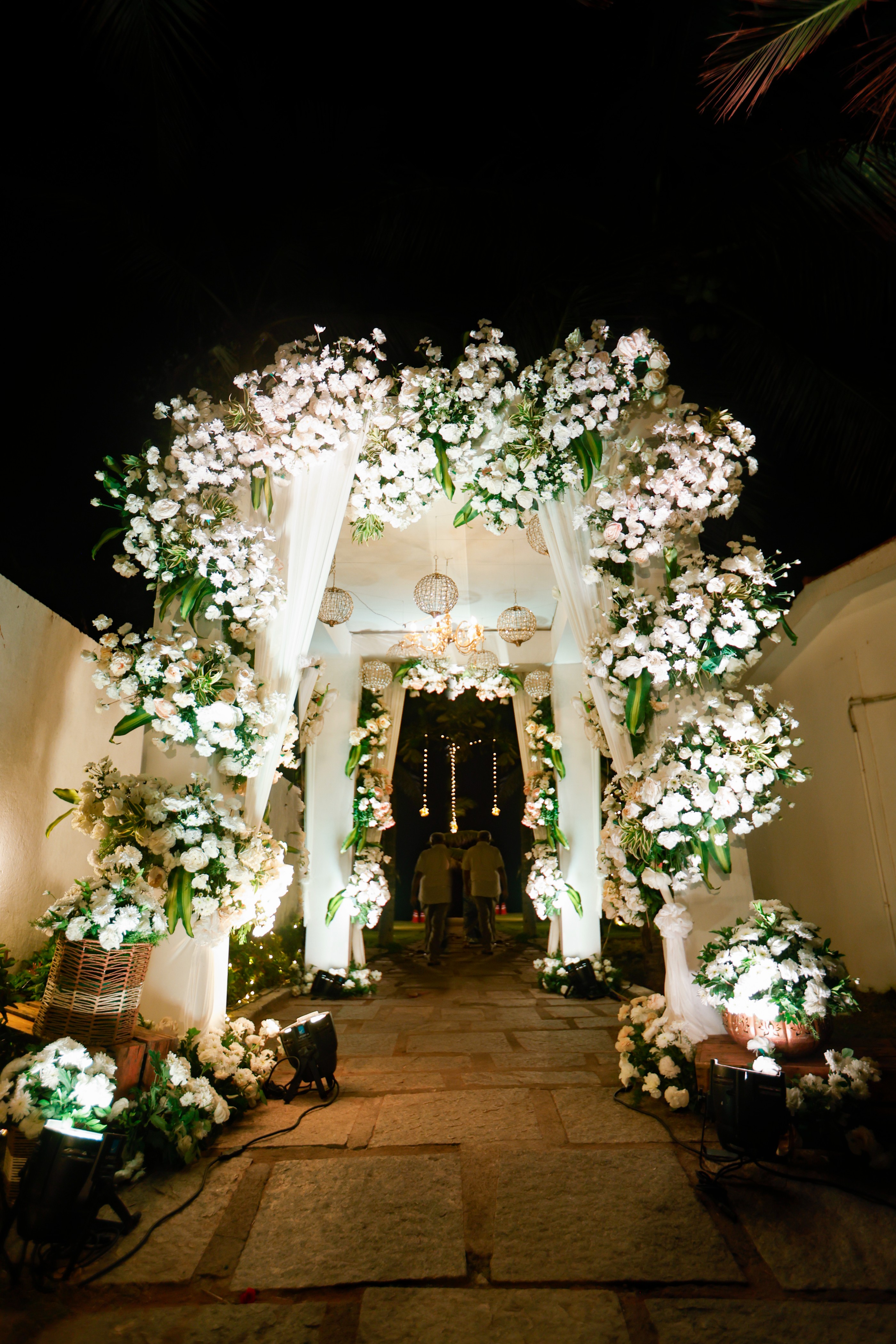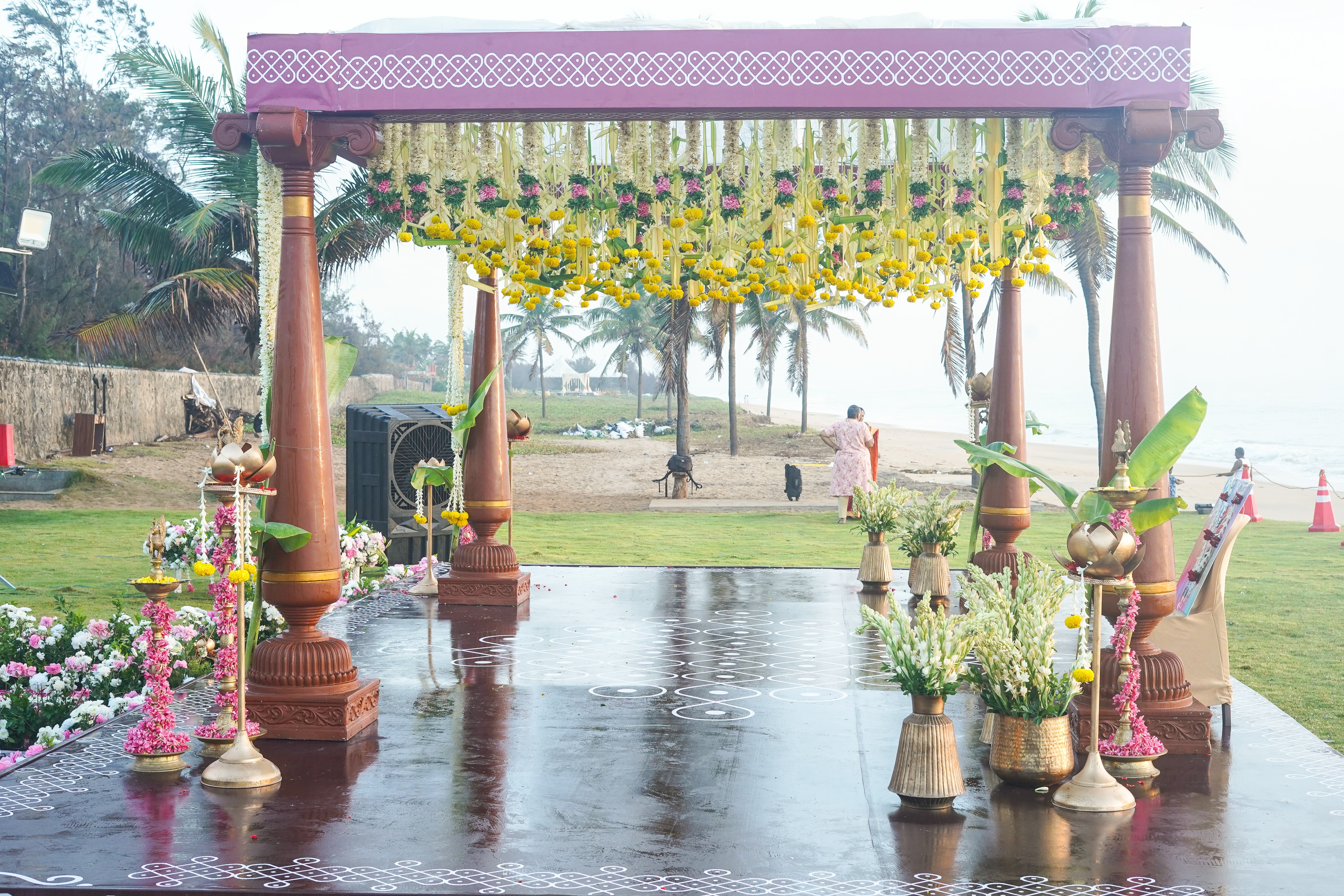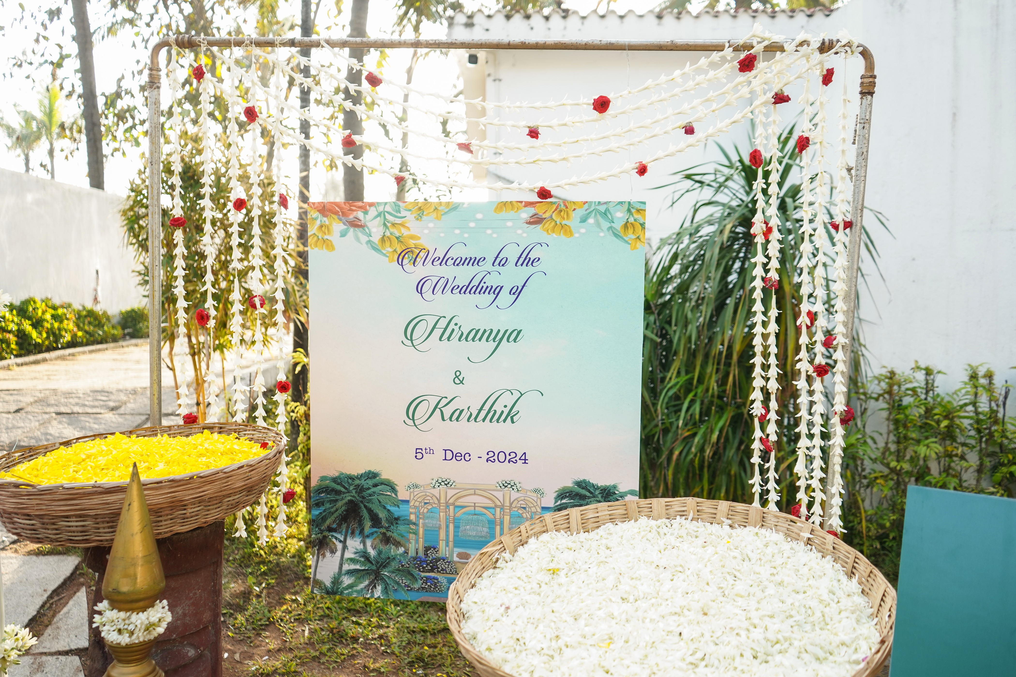 First impressions set the tone, and a thoughtfully decorated beach entrance captures the magic of the occasion. A wooden arch wrapped in florals and sheer drapes greets guests, while coconut trees dressed with fairy lights and garlands add a coastal touch. A rustic welcome sign or custom surfboard featuring the couple’s names sets a personalized vibe. Complemented with brass urulis filled with floating blooms and intricate kolams at the entrance, the welcome area blends culture and coastline elegance.