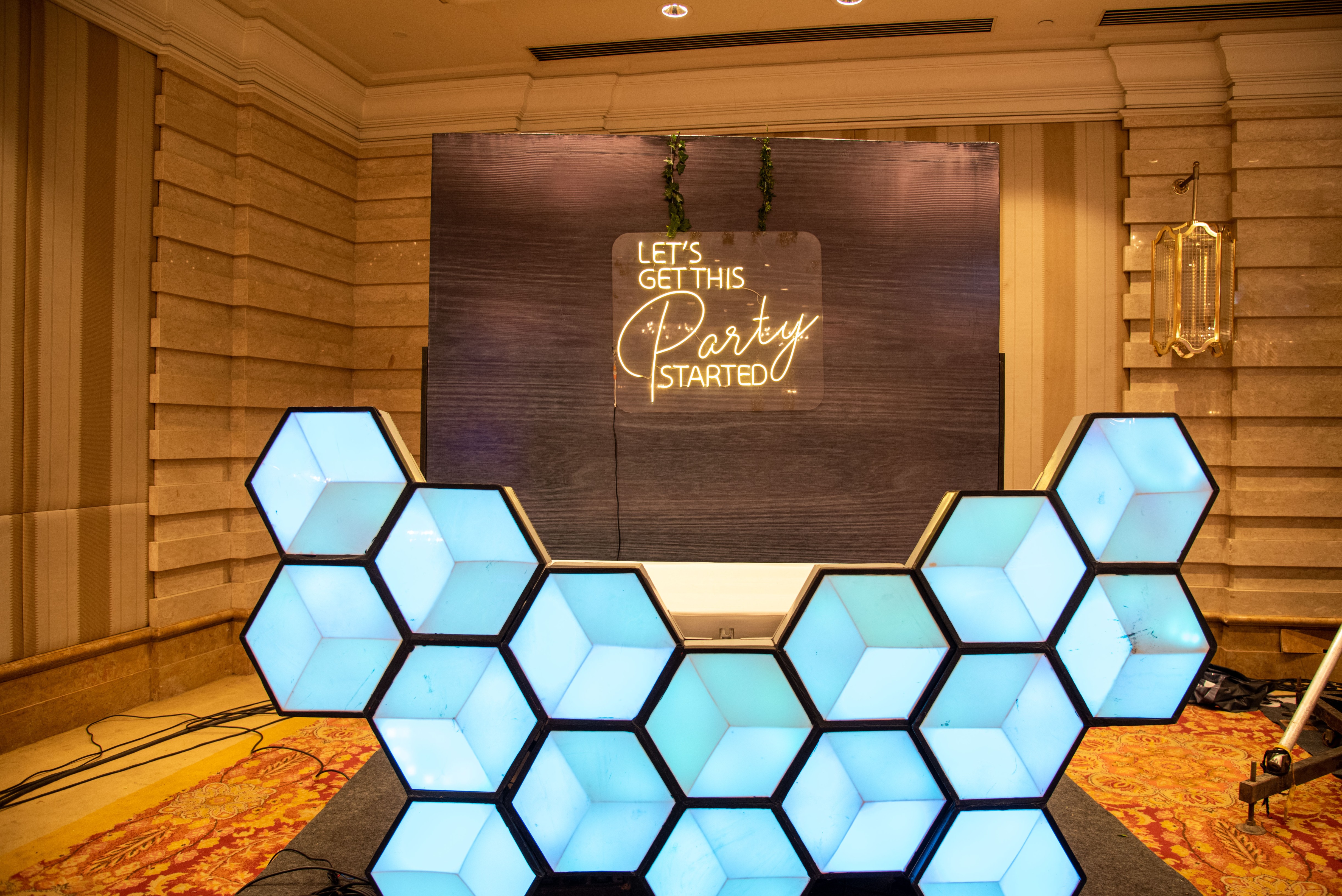 Feature a themed cocktail bar with LED lighting, a display of fresh garnishes, and a drink menu board with signature cocktails like "Midnight Mojito" or "Golden Glow Martini." Gold-rimmed glasses and fruit skewers elevate the experience.